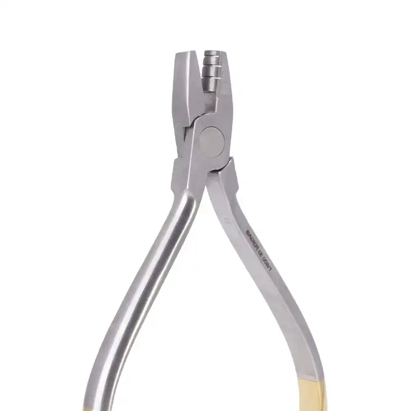 El alicate de La Rosa con ranuras se utiliza principalmente en ortodoncia, para realizar doblados y ajustes precisos en alambres ortodónticos. Las ranuras en las puntas del alicate ayudan a sujetar firmemente el alambre, evitando que se deslice durante el procedimiento.