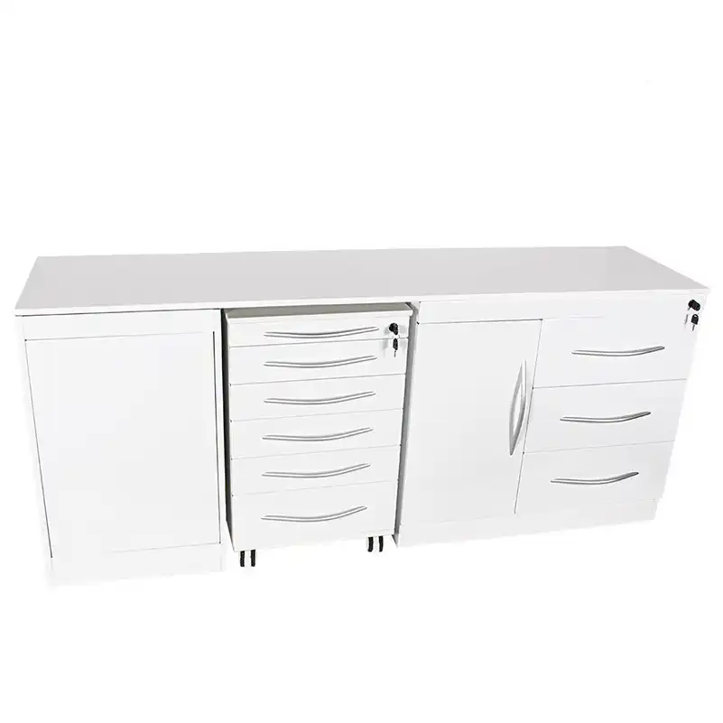 Incluye un carrito extraíble con bandejas profesionales, una cajonera doble y un módulo push-on con papelera integrada, ofreciendo versatilidad y organización en el entorno clínico.