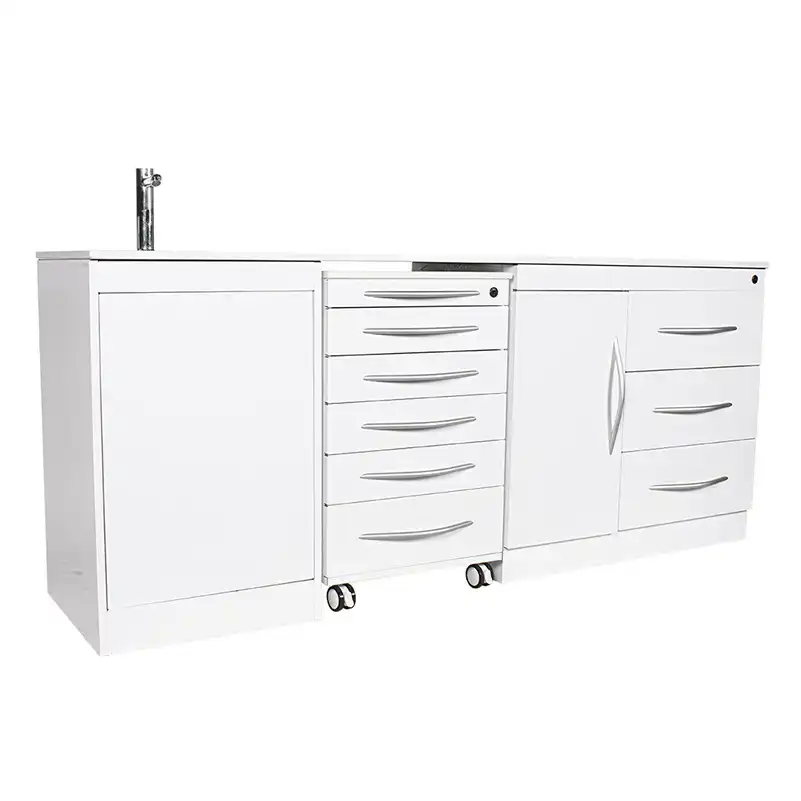 El Conjunto Mobiliario Cuádruple Push-On Bader es la opción ideal para clínicas dentales y médicas que buscan organización, resistencia e higiene. Su estructura de acero inoxidable lacada en pintura epoxi blanca y su encimera tipo Silestone® de 2 cm con cantos redondeados aseguran durabilidad, fácil limpieza y un acabado moderno.