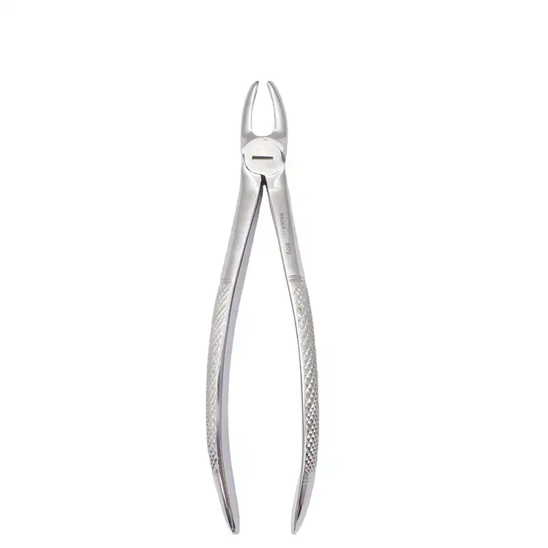 El Fórceps Fig. 17 se utiliza en odontología para la extracción de molares superiores. Su diseño específico permite una sujeción firme de las piezas molares en el maxilar superior, facilitando una extracción precisa y minimizando el riesgo de fracturas dentales o daños a los tejidos circundantes. Este fórceps es fundamental en procedimientos de exodoncia que requieren una remoción controlada de molares en la parte superior de la boca.