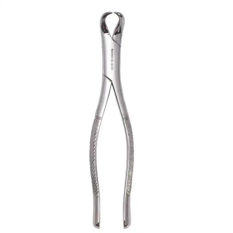 El fórceps dental figura 23 “cuerno de vaca” es una herramienta especializada para la extracción de primeros y segundos molares superiores, generalmente en ambos lados de la boca. Su característica distintiva es que posee puntas curvas en forma de cuerno que permiten un mejor agarre de los molares con raíces divergentes. Estas puntas se insertan en la zona de bifurcación de las raíces, facilitando una extracción segura y eficiente del molar sin dañar excesivamente el hueso circundante. Este diseño es especialmente útil cuando el diente está muy firmemente adherido o en casos de raíces complicadas.