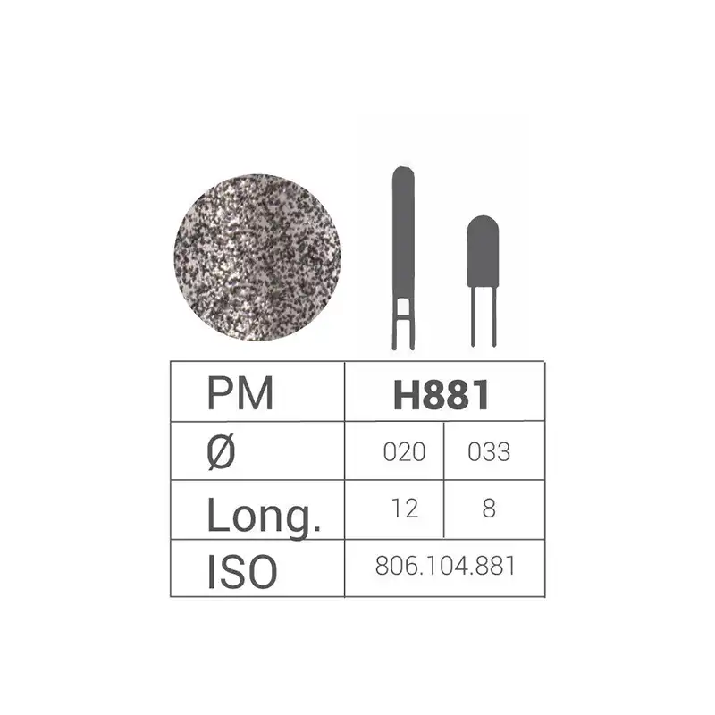 El modelo 881-HP 020-12 destaca por su forma cónica con punta estrecha, ideal para trabajar detalles finos en prótesis dentales y dispositivos restauradores.