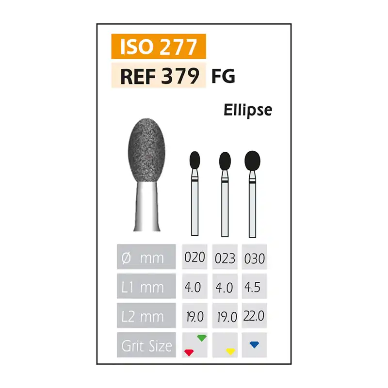 La fresa de diamante FG 379-023 C con forma elÃptica o de huevo es una herramienta odontológica diseñada para procedimientos que requieren reducción agresiva y contorneado rápido de esmalte, dentina o materiales restauradores.