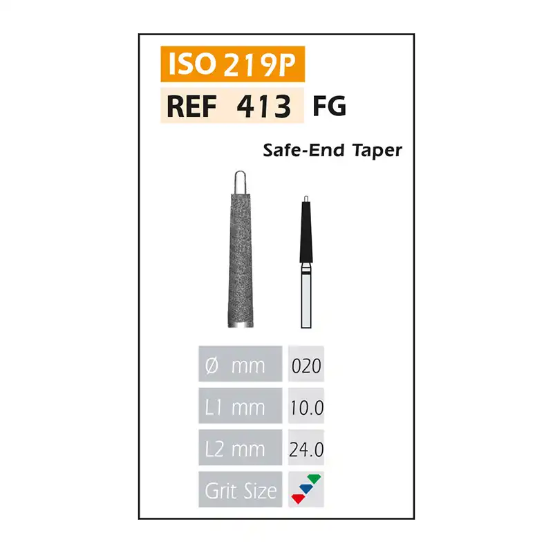 La fresa de diamante FG 413-020 F con forma de cono con bisel es una herramienta odontológica diseñada para realizar cortes finos y acabados precisos en esmalte, dentina y materiales restauradores.