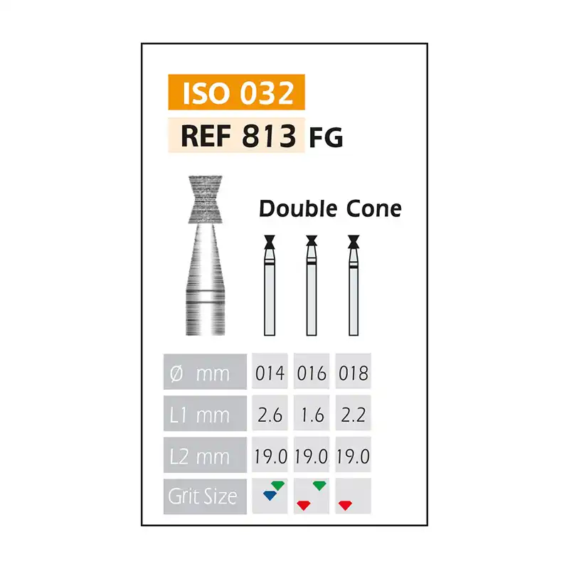 La fresa de diamante FG 813-016 C con forma de doble cono es una herramienta odontológica diseñada para realizar cortes rápidos y remoción eficiente de material en cavidades dentales y superficies anatómicas.