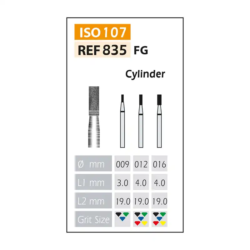 La fresa de diamante FG 835-016 M con forma cilÃndrica es una herramienta odontológica diseñada para procedimientos de preparación dental y contorneado moderado.