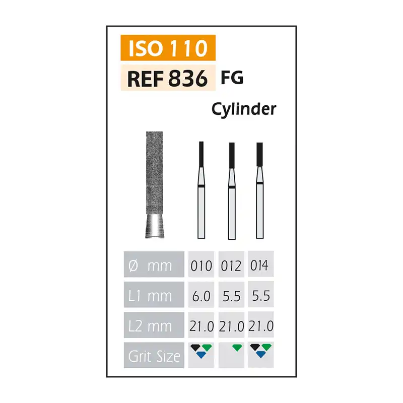 La fresa de diamante FG 836-010 SC con forma de cilindro es una herramienta odontológica diseñada para realizar cortes extremadamente rápidos y remoción agresiva de material en cavidades pequeñas y superficies dentales.