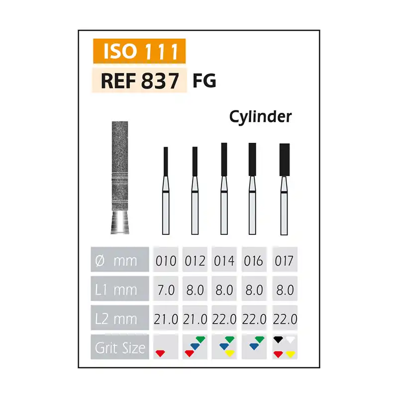 La fresa de diamante FG 837-012 C con forma de cilindro es una herramienta odontológica diseñada para realizar cortes rápidos y remoción eficiente de material en cavidades y superficies dentales.