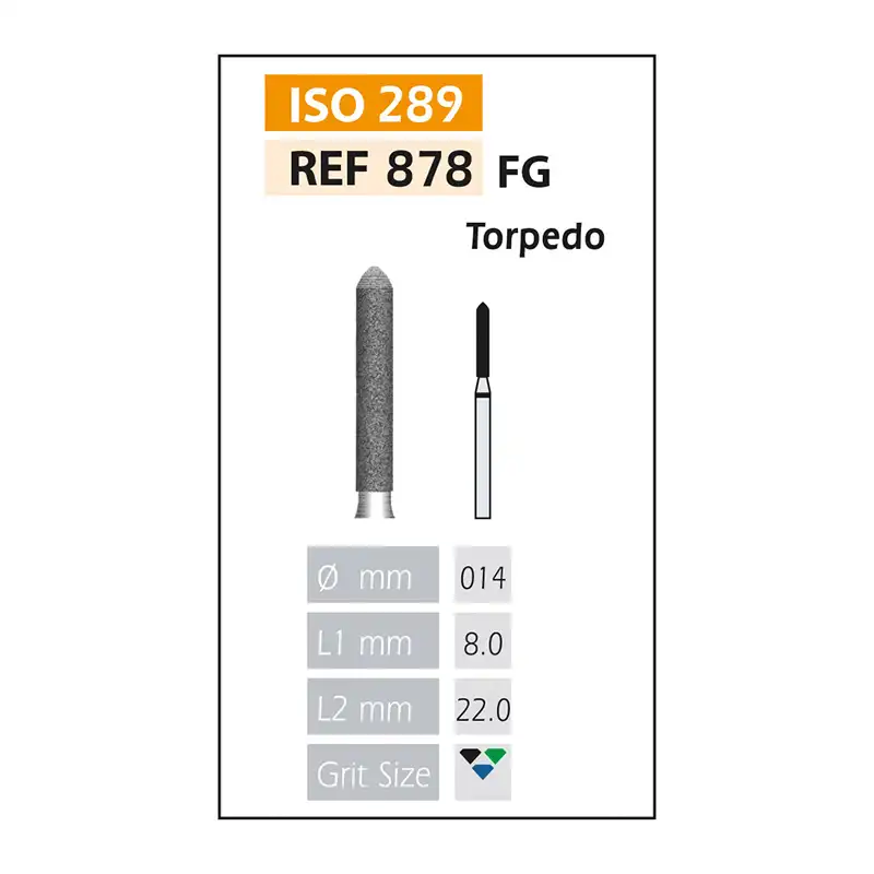 La fresa de diamante FG 878-014 M con forma de torpedo es una herramienta odontológica diseñada para realizar cortes moderados y controlados en superficies dentales, especialmente en áreas que requieren contornos suaves y transiciones precisas.