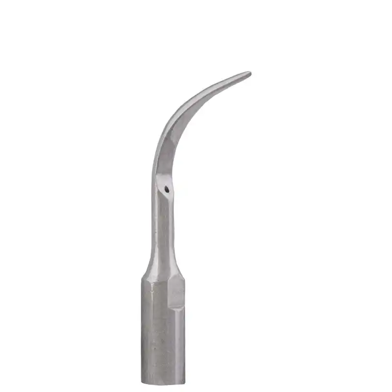 El inserto ultrasónico G4 es una punta diseñada para su uso en scalers piezoeléctricos, especializada en la eliminación de cálculos dentales profundos y duros en áreas subgingivales y superficies radiculares. Su diseño curvado permite un mejor acceso a zonas difÃciles, siendo una herramienta fundamental en tratamientos periodontales avanzados.