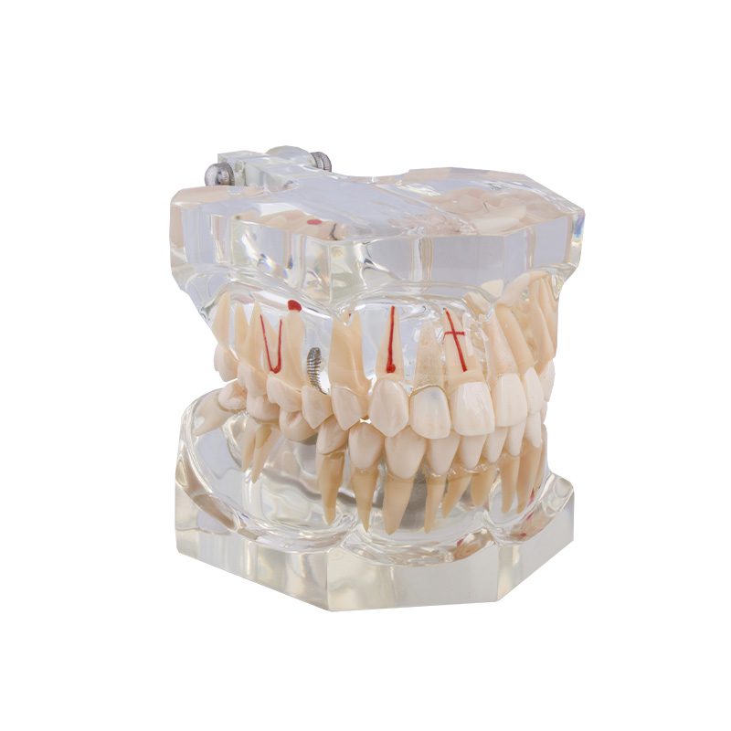 Este modelo incorpora un implante, caries con abscesos periapicales, un diente impactado, una carilla y varias coronas, lo que lo convierte en un recurso ideal para la simulación de casos clínicos reales en odontología. Su diseño es especialmente útil para complementar el estudio con imágenes de radiografías, permitiendo a estudiantes y profesionales mejorar su comprensión y habilidades diagnósticas.
