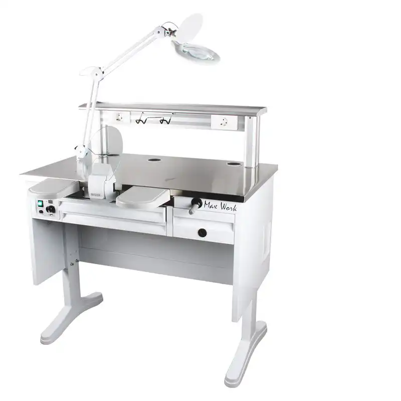 La Mesa de Trabajo Max Work Twin Bader está diseñada para optimizar la eficiencia y comodidad en el laboratorio dental. Pensada para dos usuarios simultáneamente, ofrece un entorno ordenado, ergonómico y con todos los elementos necesarios para garantizar un flujo de trabajo limpio y seguro.